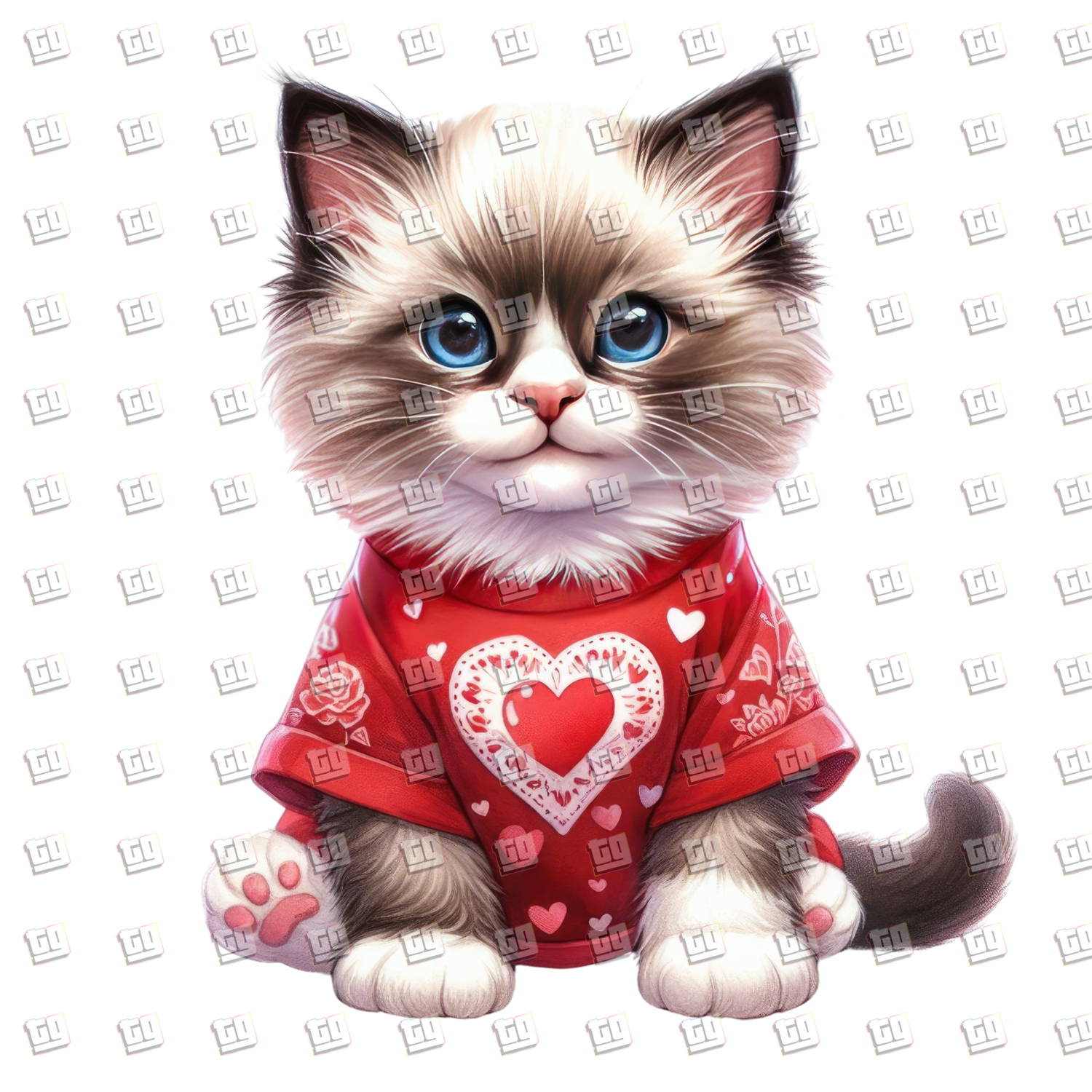 Long Haired Kitten With Red Heart Shirt` - Valentines - DTF Transfer