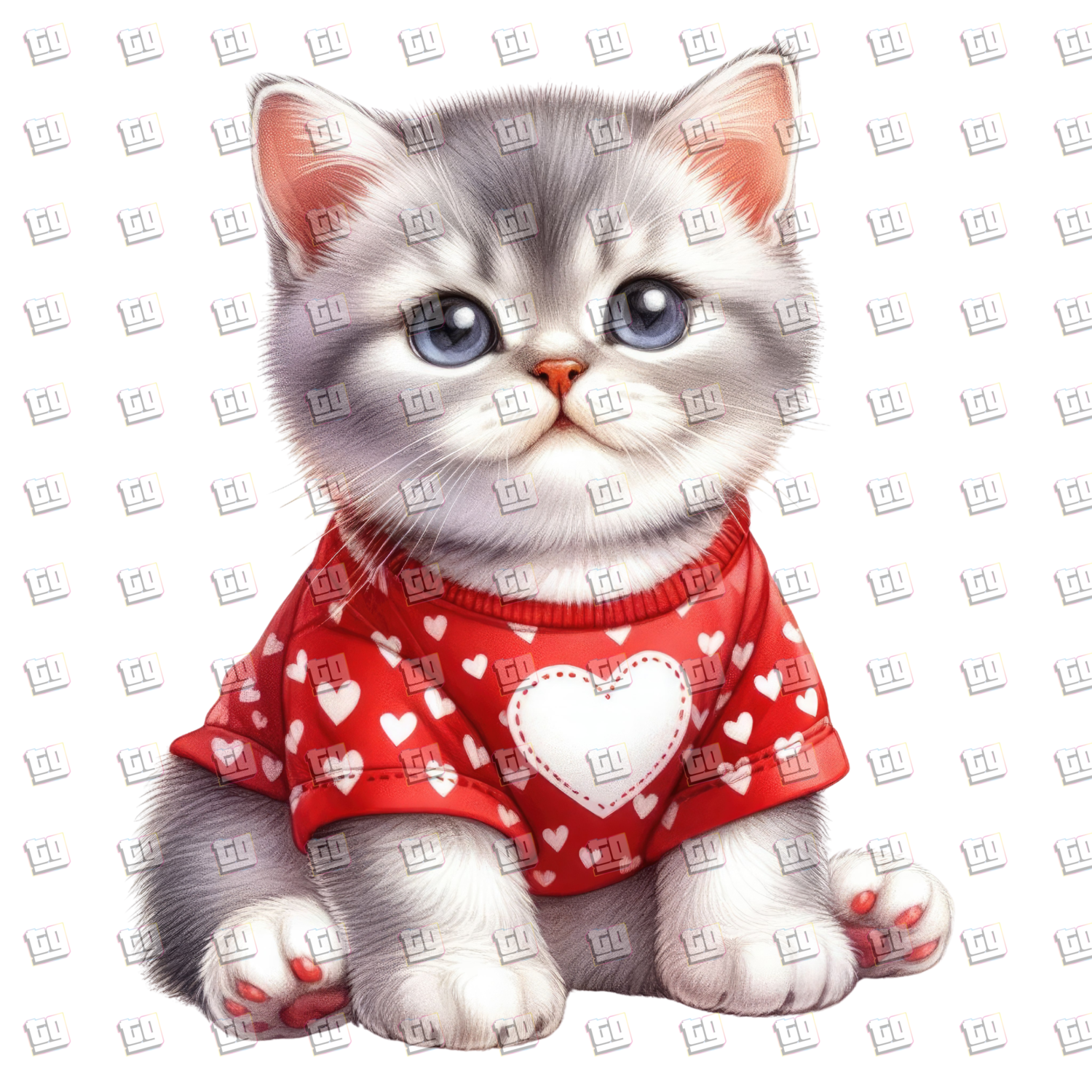 Short Haired Gray Cat With Heart Sweater- Valentines - DTF Transfer